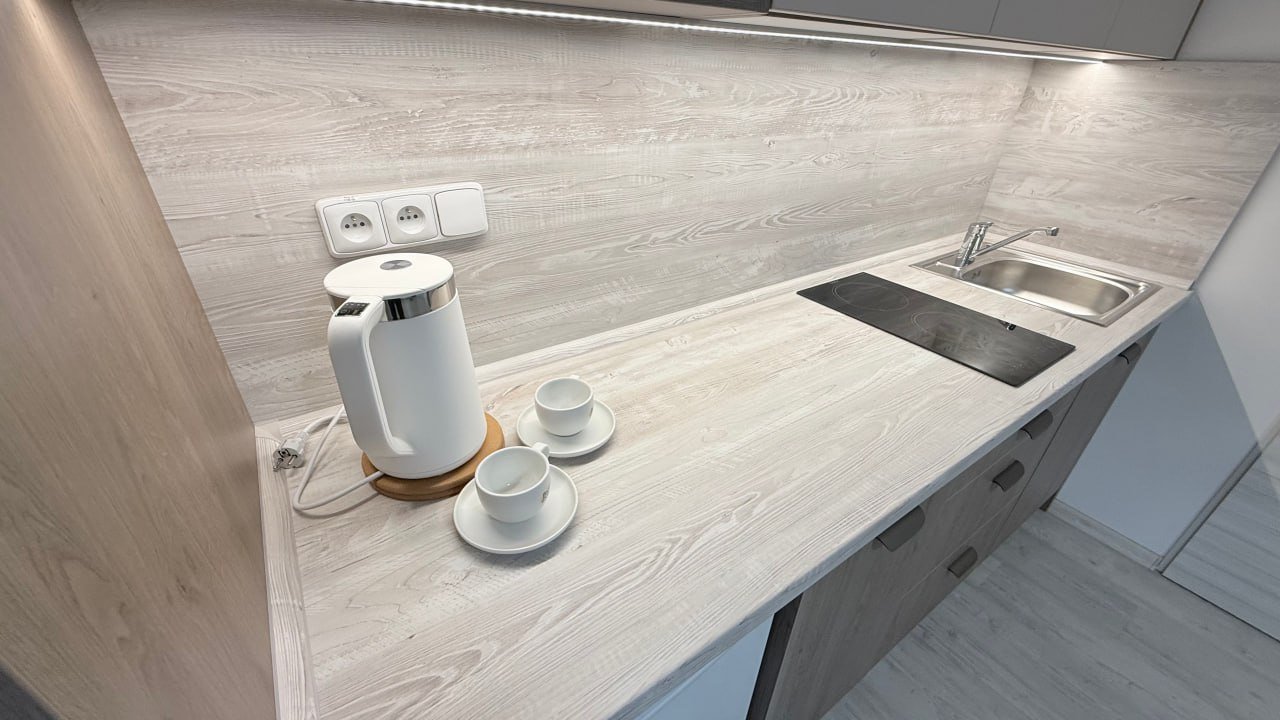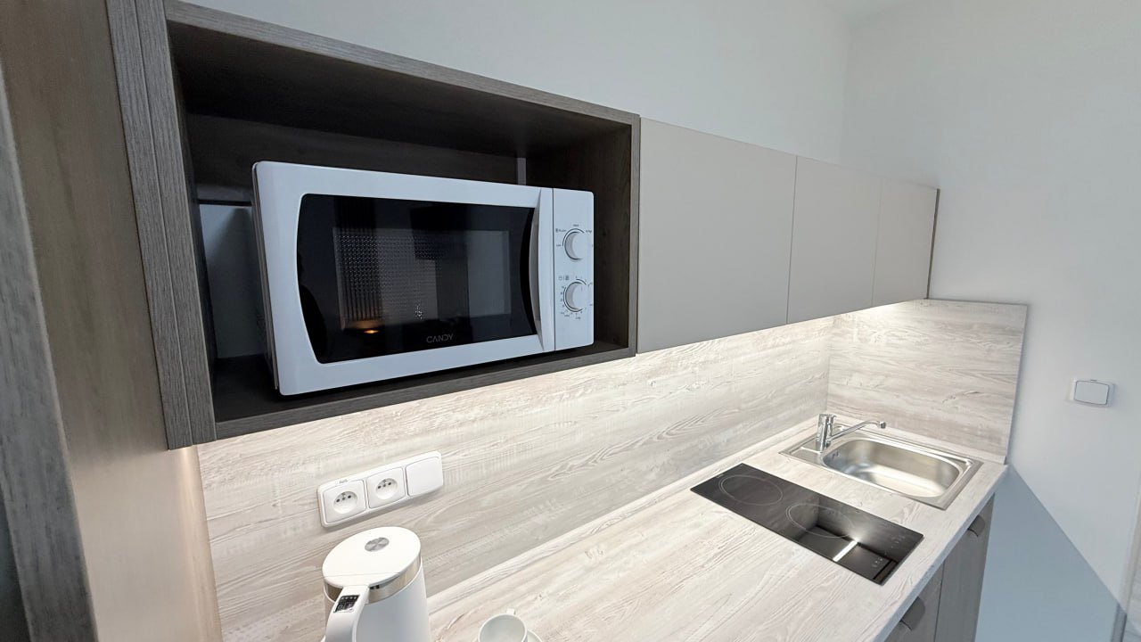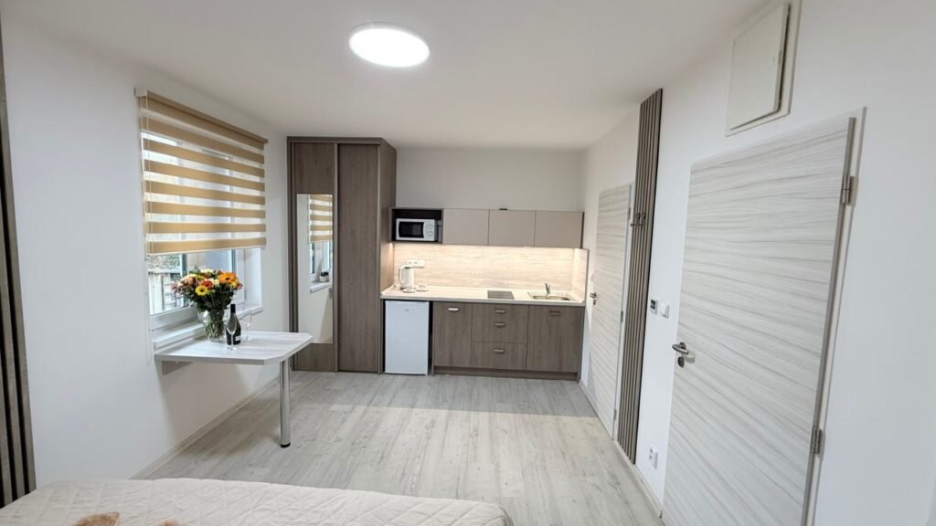 Prostorný a světlý apartmán nabízí pohodlné ubytování s velkou manželskou postelí (extra large bed), ideální pro páry nebo jednotlivce, kteří ocení komfortní spánek. V jedné místnosti je k dispozici také plně vybavená s lednicí, varnou deskou, mikrovlnnou troubou, rychlovarnou konvicí a základním nádobím.